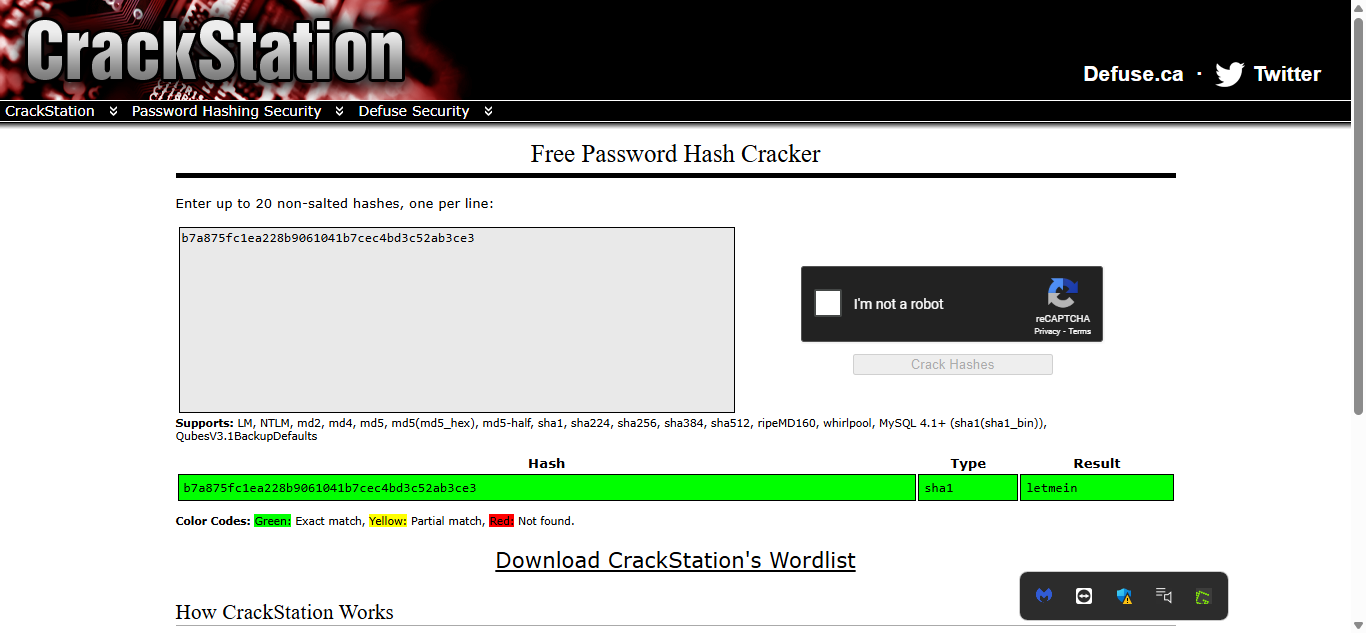The first hash I received was an MD5 hash. Since MD5 is a weak hashing algorithm and vulnerable to dictionary attacks, I used CrackStation—an online hash-cracking tool.