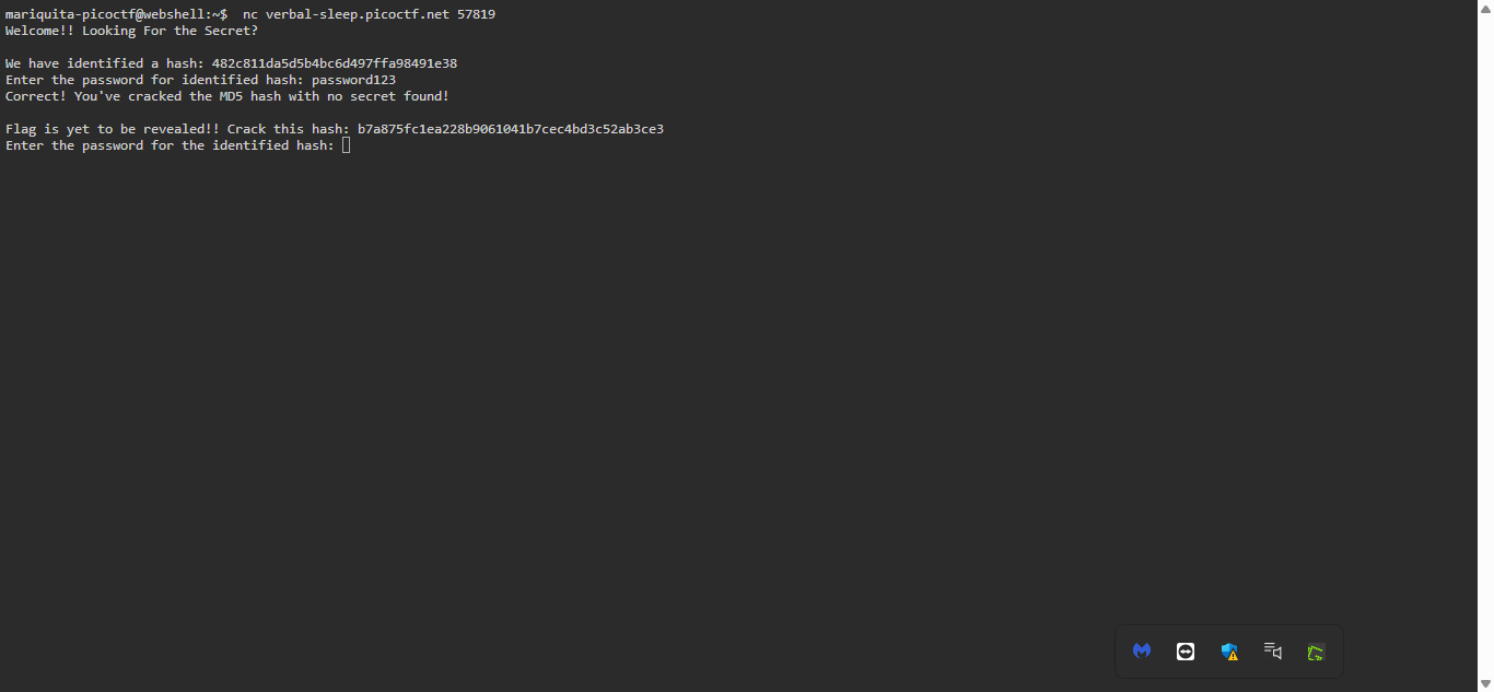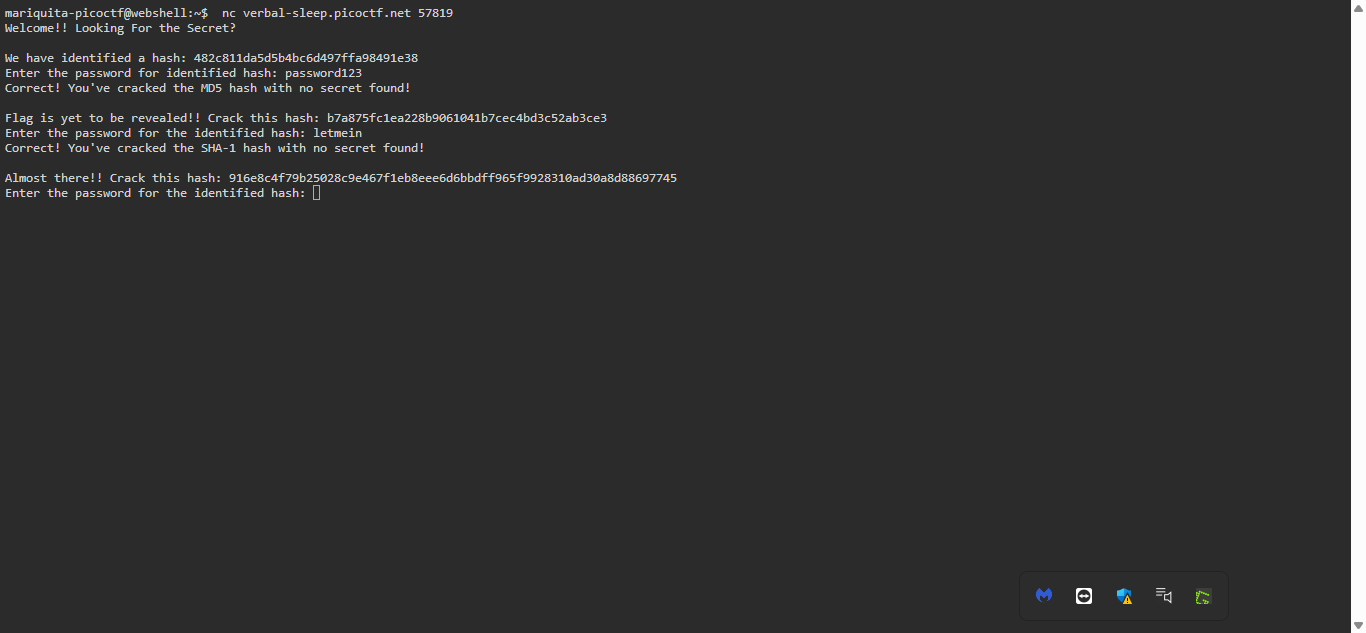In this challenge, I was provided with a netcat command to connect to a remote server. Upon connection, I received a series of hashed passwords and was required to crack them to retrieve the original plaintext values. The challenge tested my understanding of hashing algorithms and the importance of strong passwords.